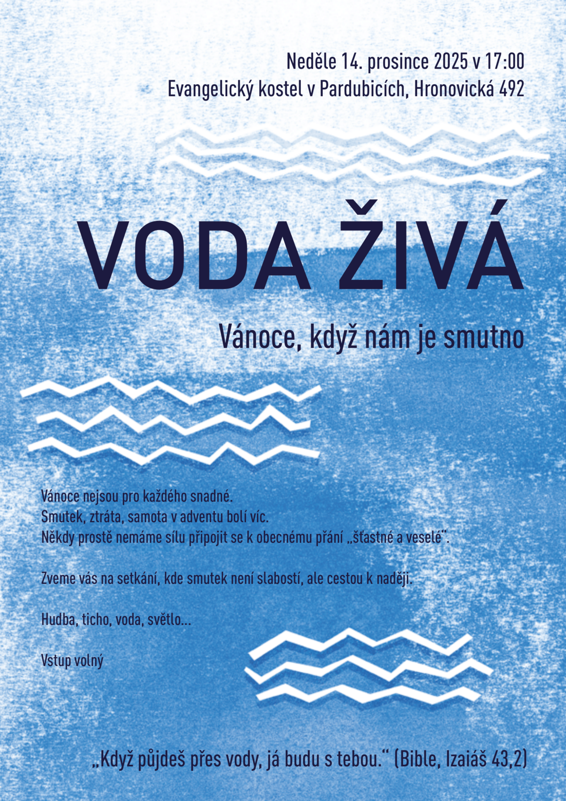 Setkání se koná v neděli 14. prosince od 17 hodin v evangelickém kostele, nese název Voda živá.